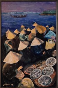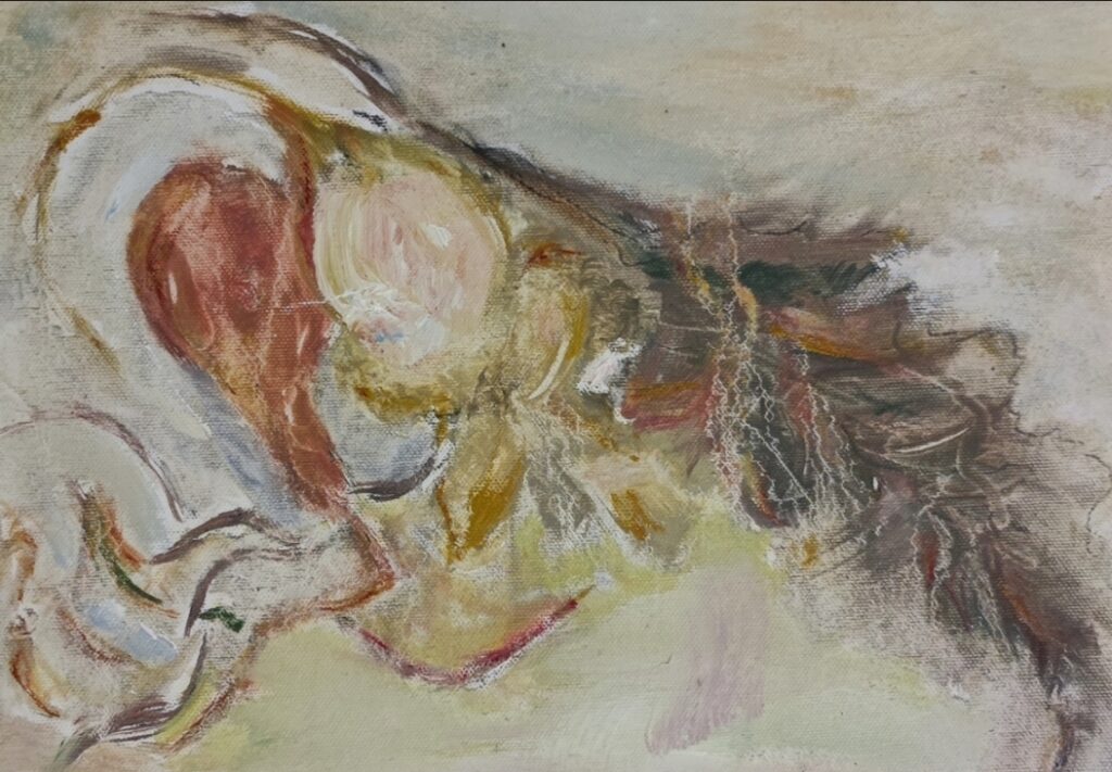 Myös kahvia ja itseleivottua kahvileipää on vieraalle tarjolla. Vantaalla asuva Salmi on pitkäjännitteinen harrastaja, opiskellut aihetta vuosien mittaan myös Vantaan aikuisopistossa. Noin kolmenkymmenen näytteillä olevan työn joukosta valitsin tähän oheiset kolme. Myös artikkelikuva on hänen siveltimestään.