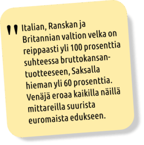 Vaihtotaseen vajeet ja korkea työttömyys rasittavat maiden budjetteja ja pakottavat valtiot velkaantumaan. Italian, Ranskan ja Britannian valtion velka on reippaasti yli 100 prosenttia suhteessa bruttokansantuotteeseen, Saksalla hieman yli 60 prosenttia.
