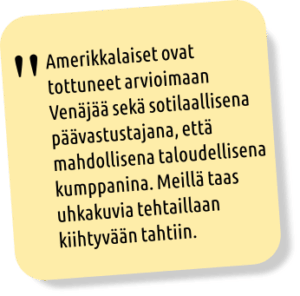 Jos olemme itse luoneet illuusioita romahtavasta Venäjästä, suurvaltojen yritysten yhteistyö venäläisten yritysten kanssa voi tulla ikävänä yllätyksenä ainakin suomalaisille yrityksille. Bondar lopettaa artikkelinsa varoituksella ”Amerikka ei voi enää vastata uusiin uhkiin vanhanaikaisella ajattelutavalla.”