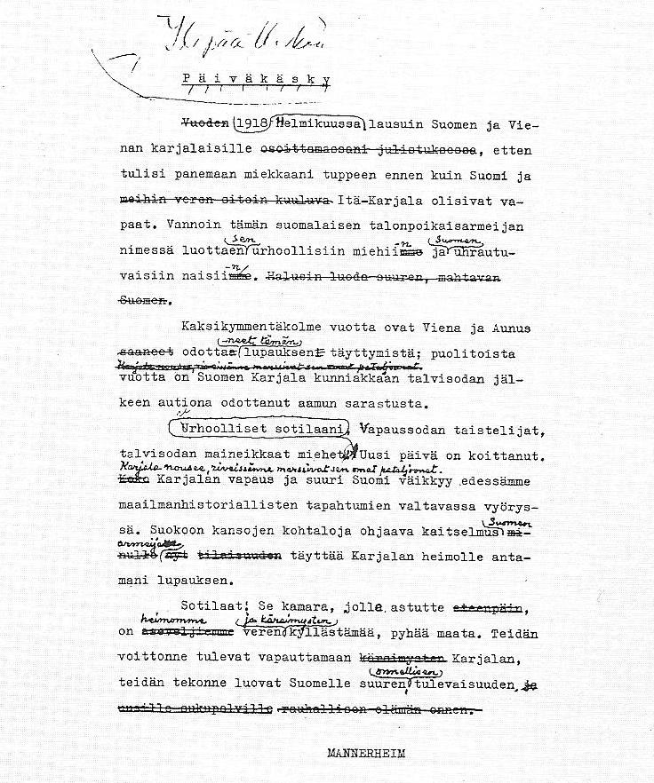 Urhoolliset sotilaat, vapaussodan taistelijat, talvisodan maineikkaat miehet! Uusi päivä on koittanut Karjalaan, vapaus ja suuri Suomi välkkyy edessämme maailmanhistoriallisten tapahtumien valtavassa vyöryssä. Suokoon kansojen kohtalo ja ohjaava kaitselmus Suomen armeijan täyttää Karjalan heimolle antamani lupaus. Teidän voittonne tulevat vapauttamaan Karjalan, teidän tekonne luovat Suomelle suuren tulevaisuuden”.