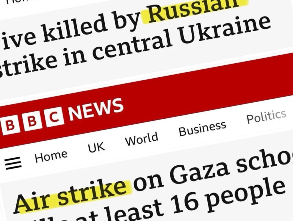Kun Israel käynnisti Yhdysvaltain luvalla, aseistuksella ja rahallisella tuella operaation Gazan (ja nyttemmin myös Länsirannan) liittämiseksi Israelin valtioon (tekosyynä Hamasin toteuttama panttivankien sieppauskeikka), tavallinenkin median seuraaja pääsi nopeasti tutustumaan tyypilliseen valtamedian harrastamaan uuskieleen. Gazan tuhoamisen uutisoinnissa on nähtävissä (kun jätetään pois päämenetelmä eli vaikeneminen, selän kääntäminen ja teeskentely, ettei mitään ole tapahtunut) kaksi päämenetelmää. Ensimmäisessä kaikki väkivaltaisuudet jotenkin vain ”tapahtuvat” eli toimeenpanijaa eli Israelin armeijaa (IDF) tai sen määräilijää eli Benjamin Netanjahua ei mainita, ilmaiskuja vain tapahtuu, pommituksia ilmaantuu ja tuhannet ihmiset kuolevat näiden tyhjästä tulevien onnettomuuksien takia. Harmillista, mutta maailmahan on vaarallinen paikka asua. Varsinkin Ison-Britannian ja Yhdysvaltain ns. laatulehdet ovat suorastaan kilpailleet siinä, miten monilla eri tavoilla kuoleman ja hävityksen toteuttaja voidaan häivyttää uutisista, jotka jostain syystä on katsottu tarpeelliseksi sentään kertoa.