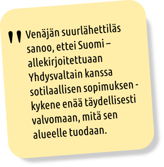 Venäjän suurlähettiläs sanoo, ettei Suomi – allekirjoitettuaan Yhdysvaltain kanssa sotilaallisen sopimuksen – kykene enää täydellisesti valvomaan, mitä sen alueelle tuodaan.