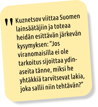 ”Esitetyt perustelut herättävät vakavia epäilyjä niiden luotettavuudesta”, sanoo suurlähettiläs. Kuznetsov viittaa Suomen lainsäätäjiin ja toteaa heidän esittävän järkevän kysymyksen. ”Jos viranomaisilla ei ole tarkoitus sijoittaa ydinaseita tänne, miksi he yhtäkkiä tarvitsevat lakia, joka sallii niin tehtävän?”.