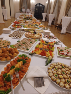 Toisessa kädessä eväslautanen ja glögimuki, toisessa snapsilasi, astelin isoon saliin, jossa oli vähintään yhtä pitkä tarjoilupöytä kuin mitä oli Putinin ja Schozin välissä ollut neuvottelupöytä Moskovassa.